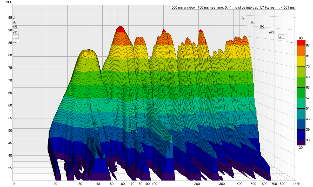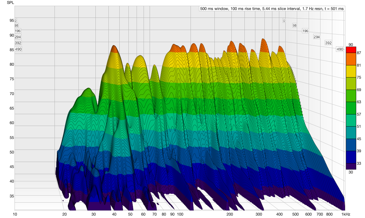 Two AVAAs in the back corners knocked that peak down by 10 dB and cut the decay time from over a second to 0.25 seconds. That's a reduction of 0.84 seconds from two units.